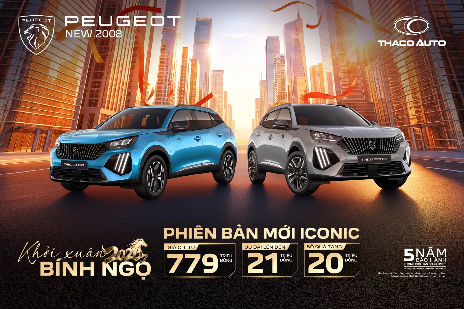 New Peugeot 2008 ICONIC – phiên bản đặc biệt mới ra mắt – được định vị là mẫu SUV đô thị châu Âu hiện đại, nơi thiết kế, công nghệ và cá tính hội tụ. Phiên bản ICONIC sở hữu ngôn ngữ thiết kế sắc sảo, khoang lái Peugeot i-Cockpit® trực quan, động cơ Turbo PureTech mạnh mẽ, nền tảng khung gầm CMP danh tiếng cùng các hệ thống hỗ trợ lái tiên tiến, mang đến trải nghiệm vận hành linh hoạt và an tâm trong đô thị. Dấu ấn ICONIC được nhấn mạnh qua các chi tiết nhận diện riêng như logo “ICONIC” độc quyền hai bên thân và phía sau xe, logo “2008” màu xám Basalt, cản trước ốp xám Meteor. Khách hàng có thể lựa chọn nhiều màu ngoại thất, nổi bật là Xanh Obsession Blue đổi sắc theo góc nhìn, cùng tùy chọn ghế da nâu cao cấp sang trọng. Dịp Xuân Bính Ngọ, New Peugeot có giá từ 779 triệu đồng, kèm ưu đãi trị giá 21 triệu đồng – lựa chọn phù hợp cho người trẻ cá tính, người mua xe lần đầu hoặc mong muốn nâng cấp lên SUV.