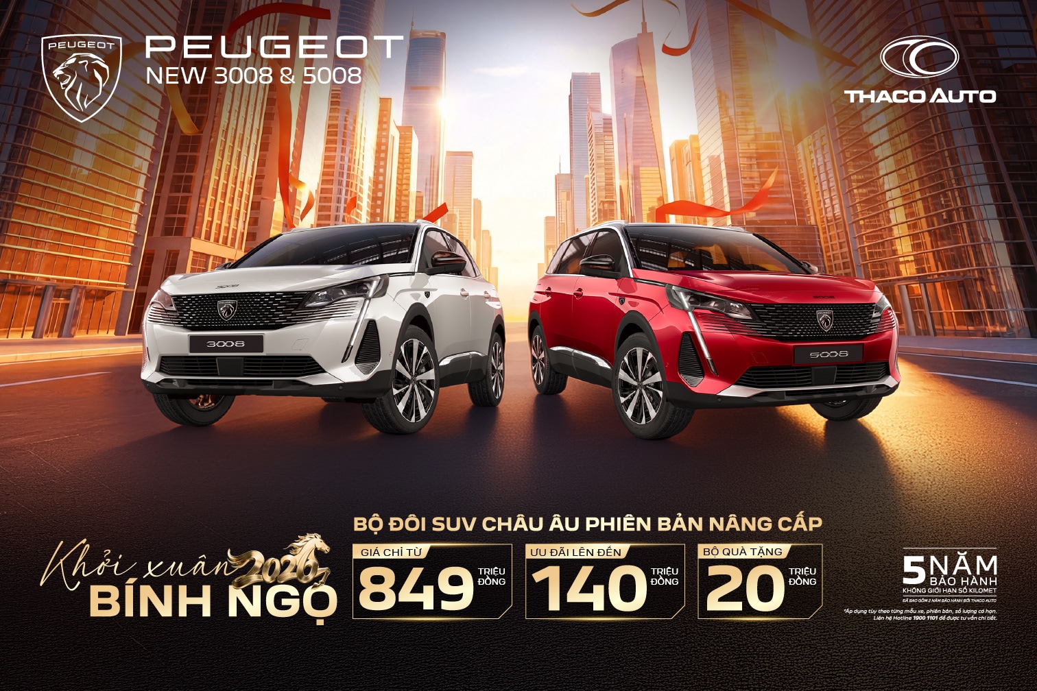 Peugeot gia tăng giá trị sở hữu với chính sách bảo hành 05 năm không giới hạn km, quà tặng đến 20 triệu đồng cùng dịch vụ lái thử linh hoạt tận nơi, giúp khách hàng an tâm trải nghiệm trước khi quyết định mua xe.
